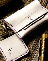 Made from the legendary GhostShip Leather, the Captain hand makes each set. Two versions are available, Purple with White finish (shown) or an ultra dope Red with Black finish (not shown, but dare to be bold!), each with complimentary thread and featuring the Viking rune Fehu, which imparts good fortune and foresight to the holder of the coin slip. The Pirate Wallets have the same thread, but with the Black Flag EDC Jolly Roger debossed into the center of the strap. The inside is large enough to hold 10 cards once broken in. Everything is hand-sewn by the Captain himself.